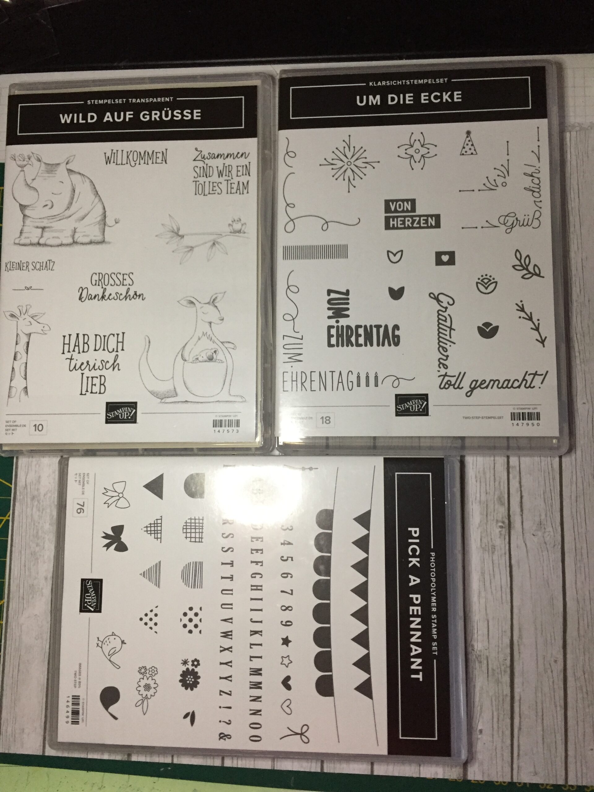 Gleich bei der Anmeldung haben wir diese hübsche Tasche bekommen. Dort war die Lightbox, die unten im Bild zu sehen ist und das Stempelset „Wild auf Grüße“, drei Kugelschreiber, sowie das Lanyard enthalten. Am Platz hat uns noch ein Planer empfangen. Nach und nach erhielten wir noch zwei Stempelsets. Zum einen war das „Um die Ecke“ und „Pick a Pennart“.